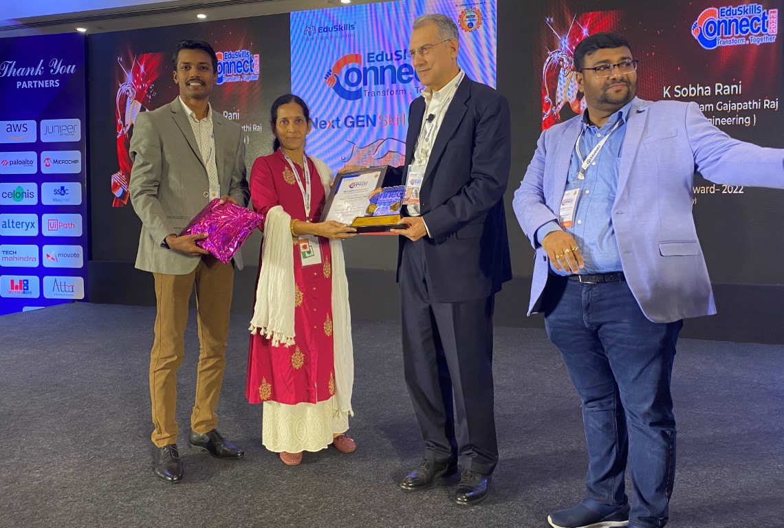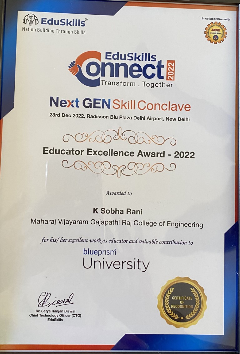 Mrs.K.Sobha Rani, Associate Professor, IT and Section Head, CSE(AI&ML), receiving the Educator Excellence Award-2022, All India 1st Rank in “Process Automation using Blue Prism” AICTE Virtual Internships, from Mr. Peter Gartenberg, Managing Director & President for Indian Subcontinent at Blue Prism, at New Delhi, Dec 23rd, 2022.