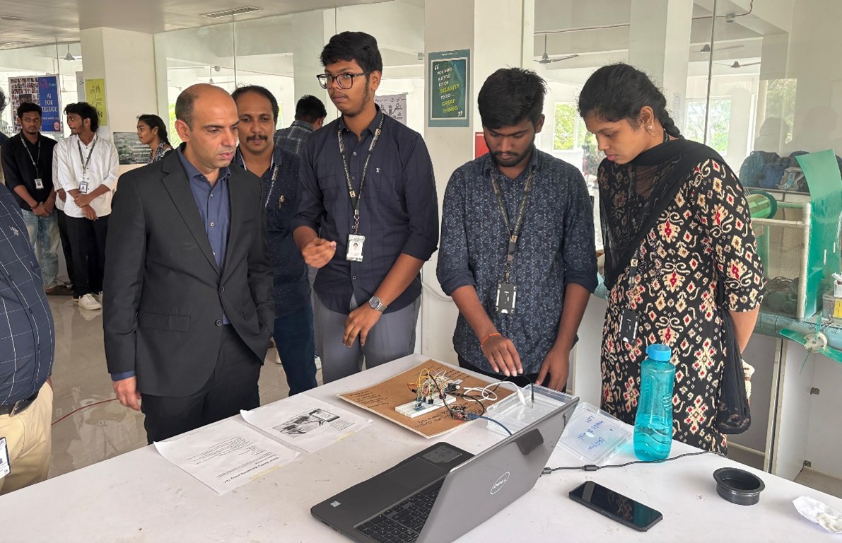 The interactive session concluded with a thought-provoking Q&A, where students discussed real-world challenges and career opportunities with Mr. Kapoor. Later, he visited the student project exhibition featuring innovations in AI and IoT. He praised standout projects such as Clean Route (Open Street), Freedom Box, Indoor Air Quality Monitoring System, Gesture Vocalizer, and Real-time Pothole Detection, offering constructive feedback and insights for future development.
