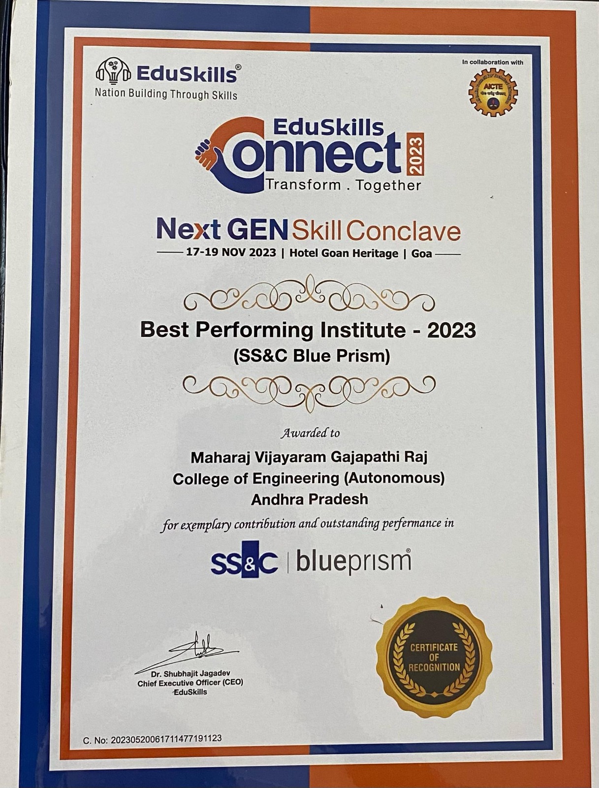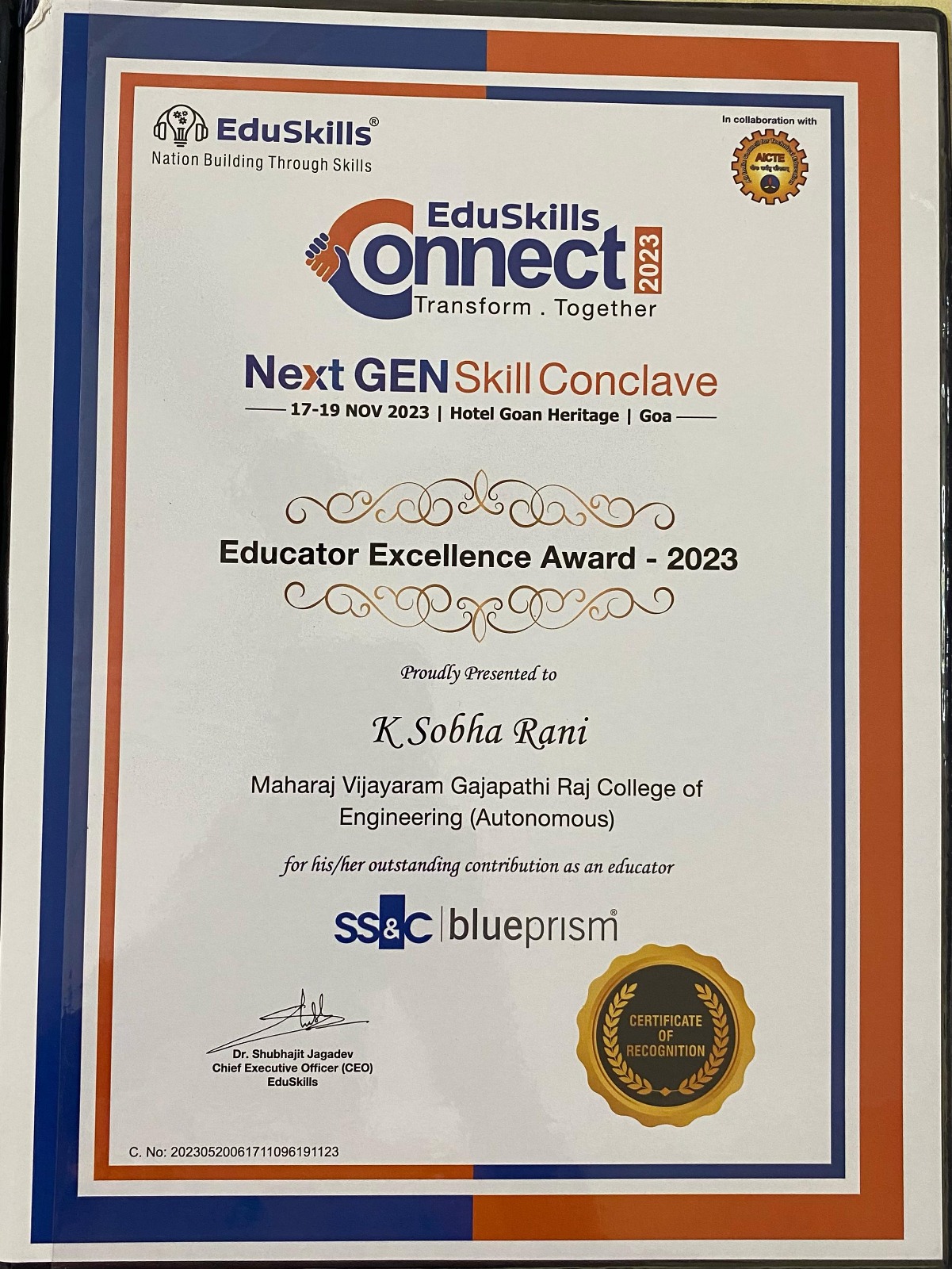 MVGR received the following awards during Eduskills Connect 2023, Conducted on 17th -19th Nov 2023, Goan Heritae, GOA.