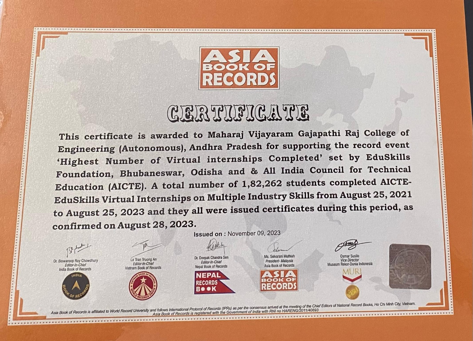 Award1 : Contribution towards "Asia Book of Records 2023 " for highest number of virtual internships during a span of 2 years.