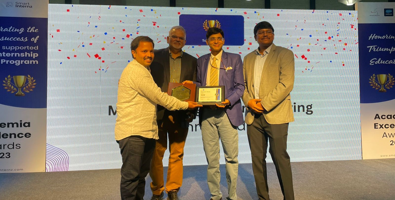 MVGR College of Engineering has been honored with the Academic Excellence Award in the Talent Hub category for its outstanding achievement in facilitating Salesforce virtual internships resulting in the highest number of placements in 2023. The prestigious award was bestowed upon MVGR at the Academia Excellence Awards event, hosted by SmartBridge on March 4, 2024, in Hyderabad.