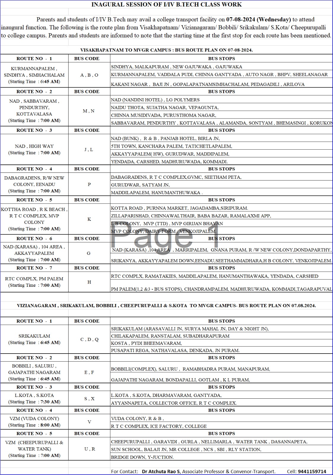 1st Years inaugural function on 7-Aug-2024. Students & Parents can avail college transport facility as follows