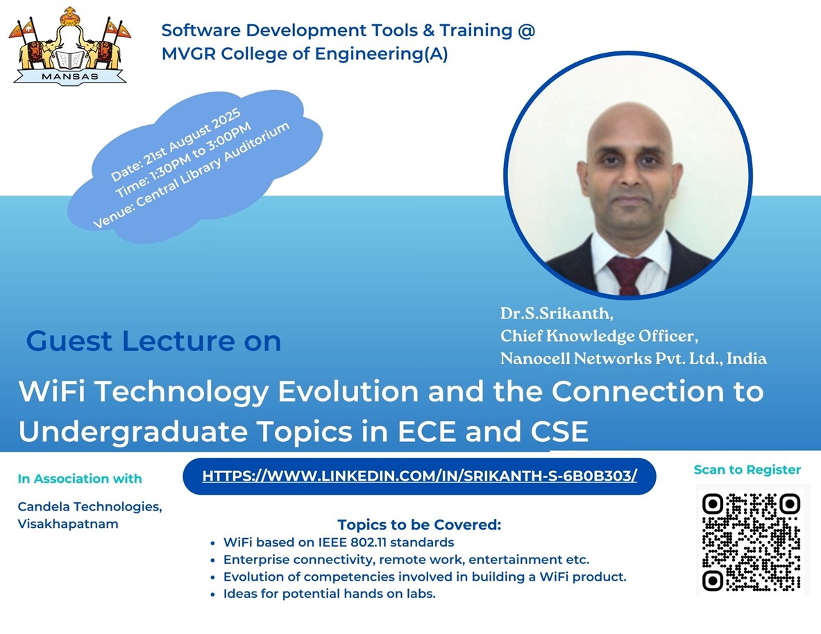 The Software Development Tools and Training Team at MVGR College of Engineering, in collaboration with Candela Technologies, Vizag, successfully organized a Guest Lecture on the topic “Wi-Fi Technology Evolution and the Relevance to Hands-on Communications, Networking, and EdgeAI Topics” on 21st August.