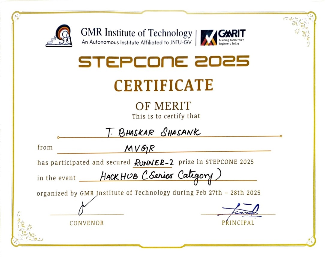 Vizianagaram, March 1, 2025: MVGR College of Engineering is proud to announce that its students have secured the Runner-up position in the prestigious HackHub event at STEPCONE 2025, hosted by GMR Institute of Technology (GMRIT). Their remarkable dedication, teamwork, and innovation have brought significant recognition to the institution.